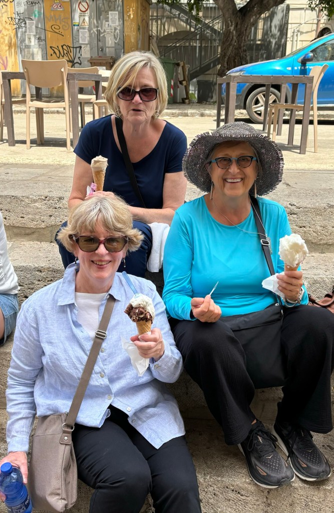 So, “the toes” made the trip in a single pair of black Hokas. Seven months post surgical, 3 months after the pins that extended beyond the 2nd/3rd toes on my right foot were removed leaving only a new, fancy metal plate across my metatarsals. It’s been awhile now since we got home and though I was much put out while packing, I don’t remember much about my recovering foot really, except that only one pair of shoes leaves room for other things and it’s hard to visualize yourself as a sophisticated traveler who may wear only practical shoes. I did take a gel pack that isn’t my first choice of item to use valuable luggage real estate. Perhaps Beth and Mary remember more about my toes during the trip than I do, as I know I had some days that my toes let me know I was doing a lot and I slowed or shortened our excursions about Puglia and Sicily I’m sure … they tolerated me very graciously. I was the one with the newest implant, but Mary and Beth got security check attention for their new joints! All reminders that we’re lucky to have the health (and procedures 😉) that make our travels possible.