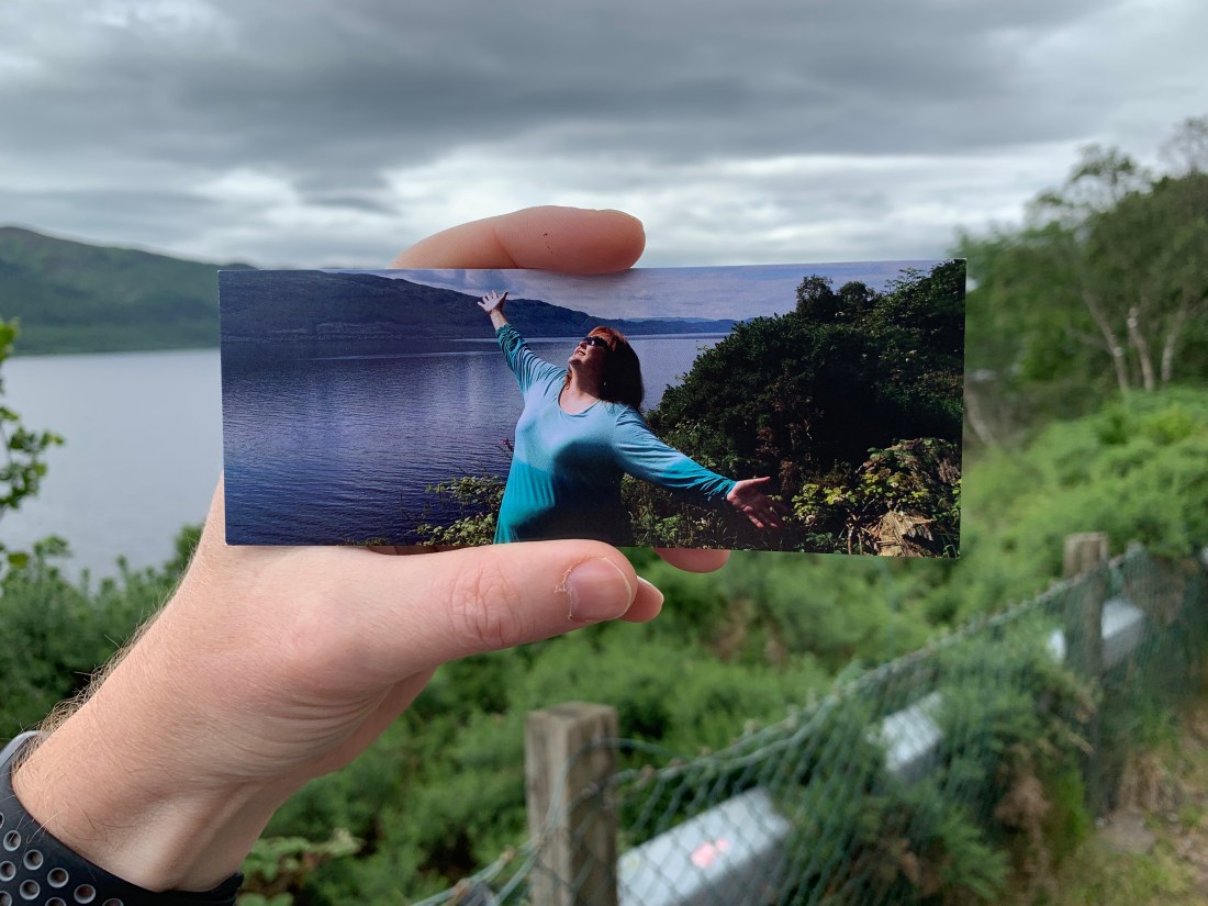 And here you can see we found the Scottish countryside where the photo was taken. A roadside viewpoint on Loch Ness (date 2016).