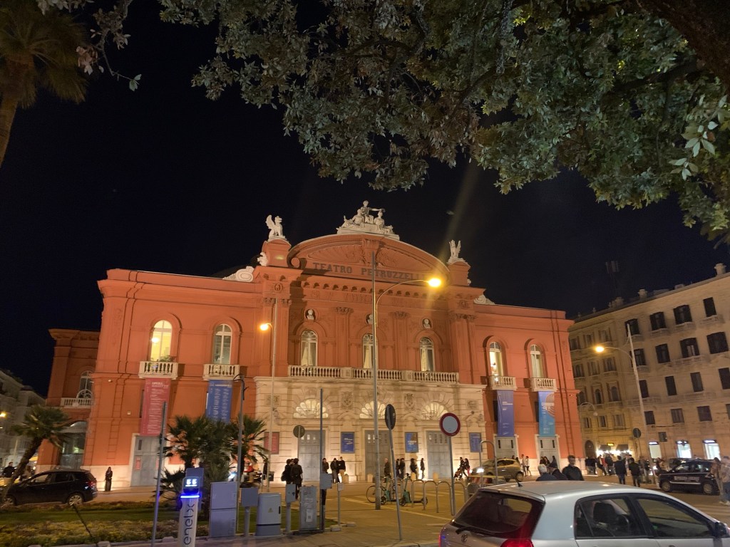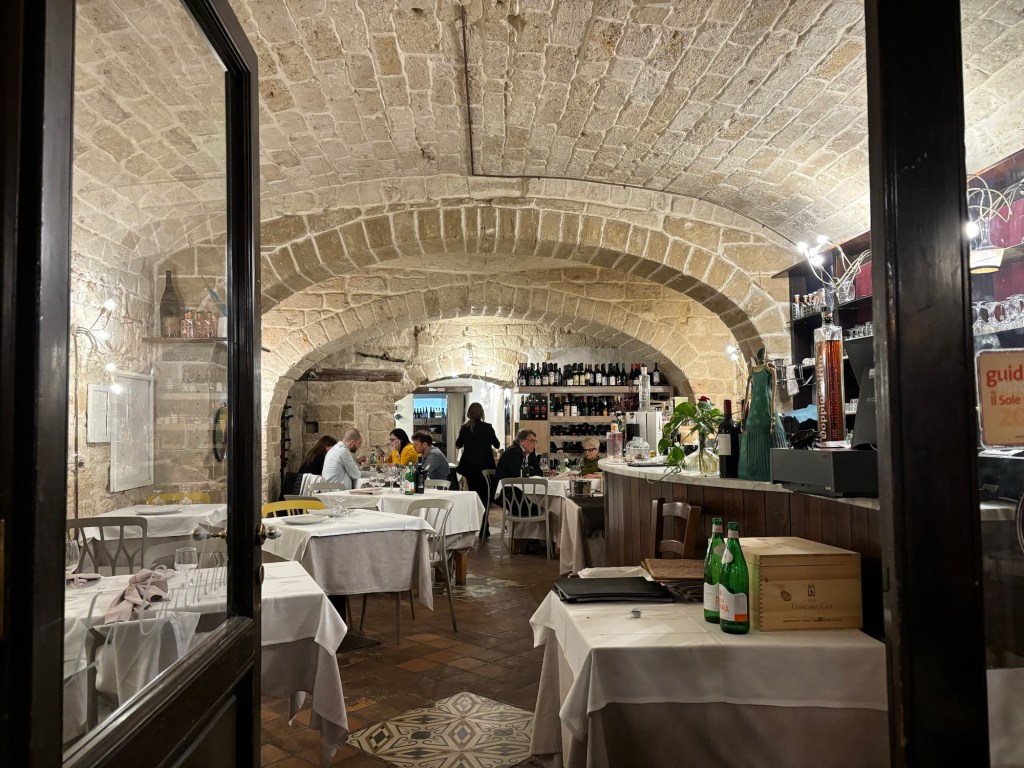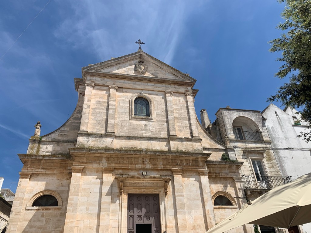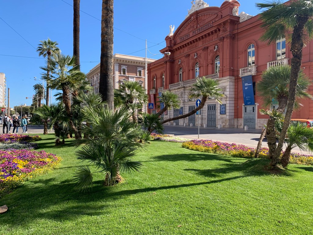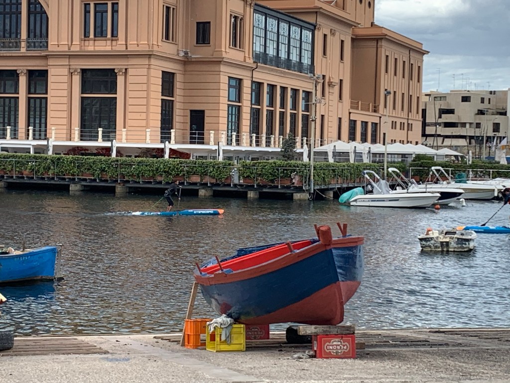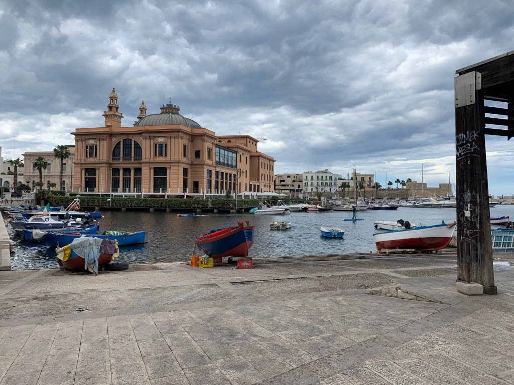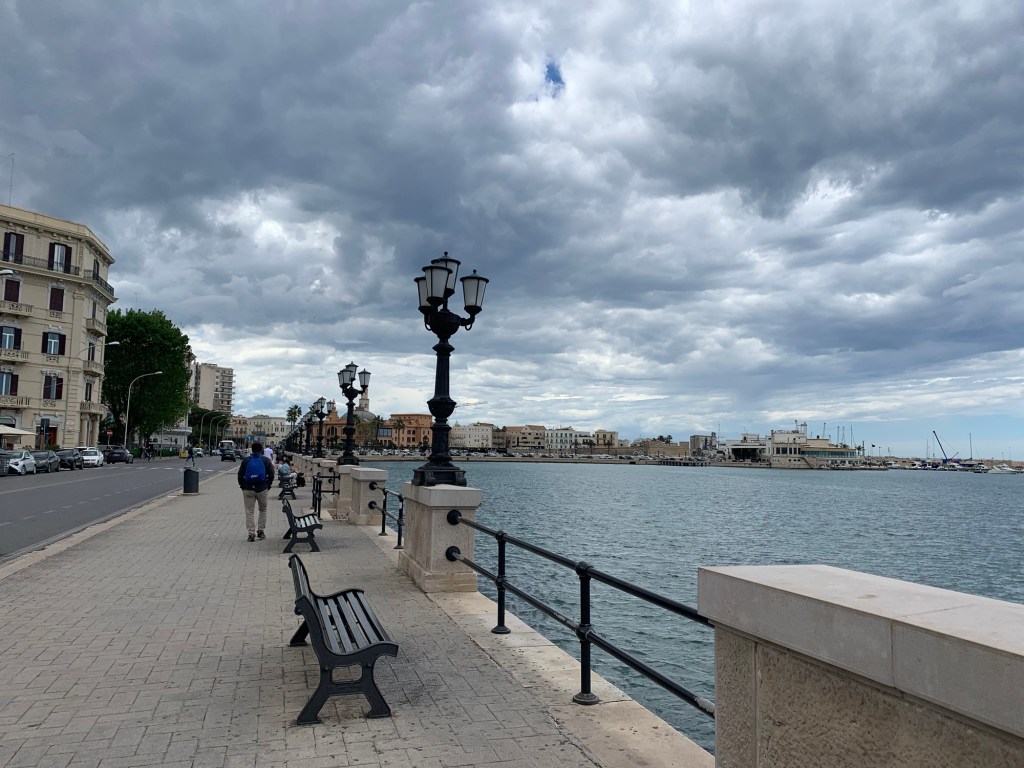 Bari is a port city. Much less touristed than other spots in the country by report. We’re staying in the old, historical neighborhood which is quaint, comfortable and includes the marina, charming piazza’s and great examples of mixed use design that just happened through the years. Think laundry hanging above the cozy lanes from piazza to piazza co-existing with restaurants and al fresco dining. We had a blue sky greeting from Bari that turned into a short thunderstorm (precipitating a welcomed nap). We think tomorrow will be dry.