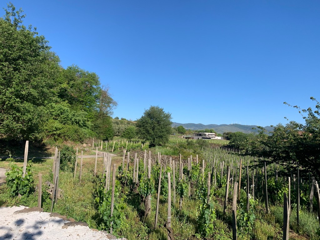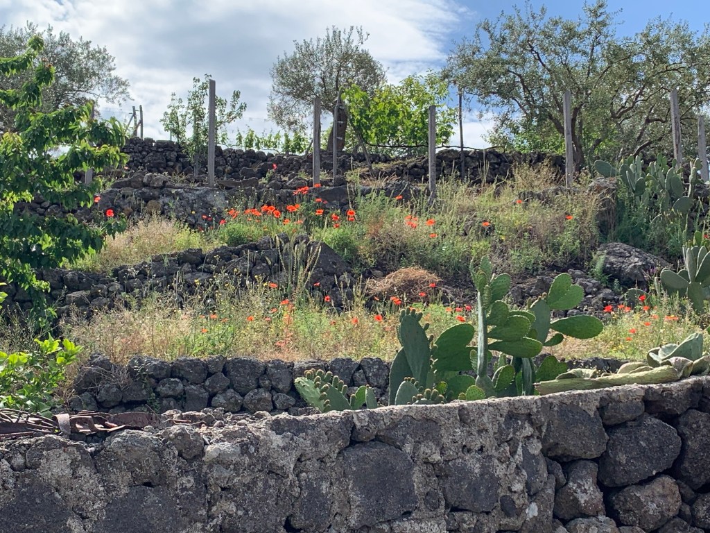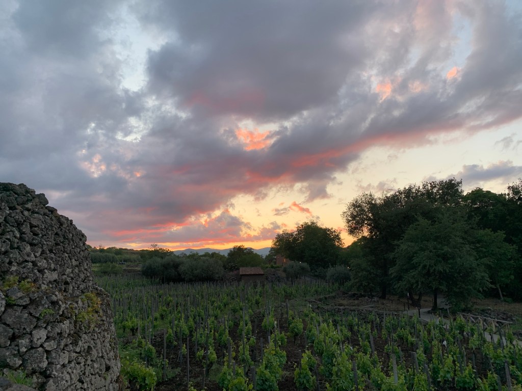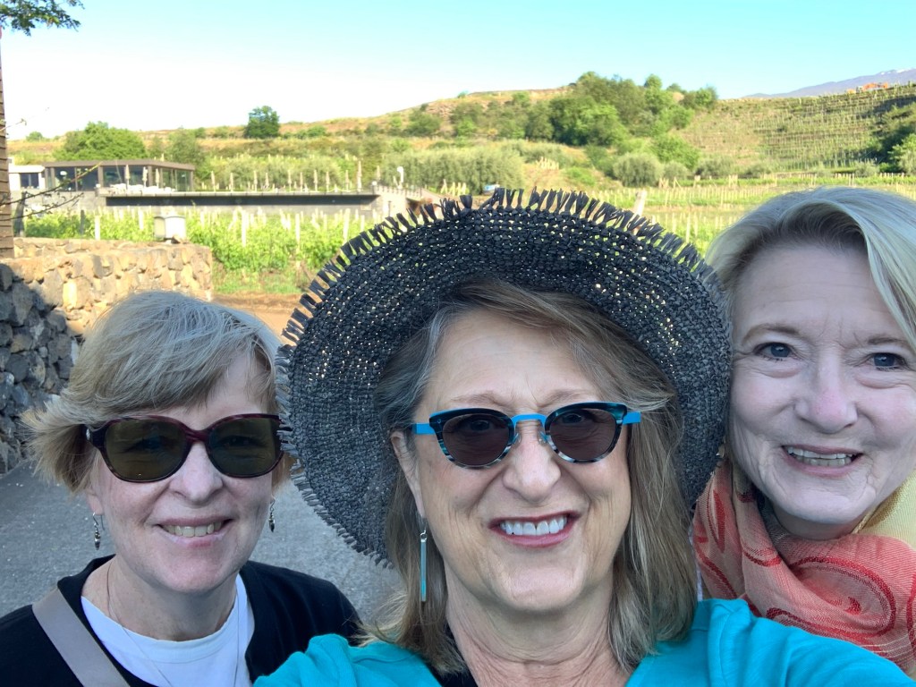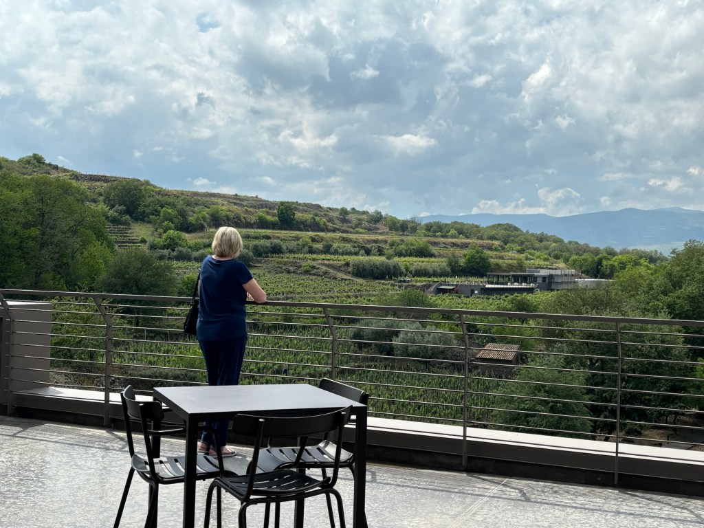 A dinner wine tasting (with a dose of confusion caused undoubtedly by my lack of language and customs) was an extended affair. Italians all seem to know the benefits of drawing out the pleasure of wines and food. We walked back to our room through the vineyards – 75 year old vines being studied for their resistance to the grape phylloxera ( I think). The volcanic soils are supposed to create wonderful wines. And we found them pretty palatable🍷