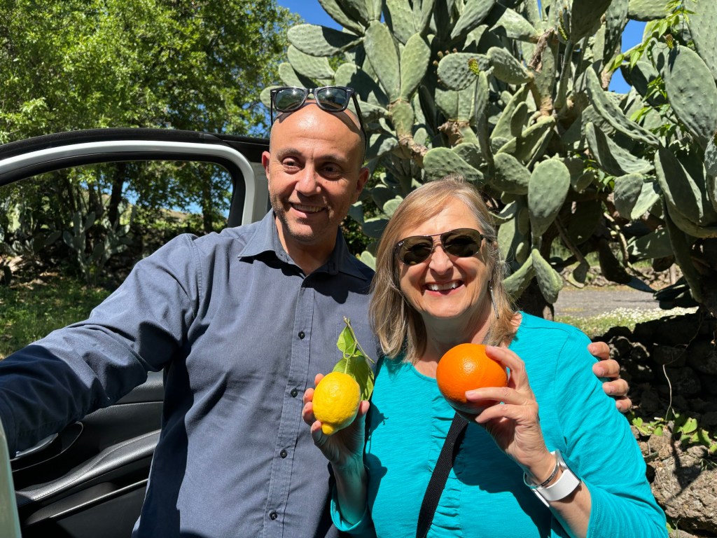 Breakfast and off with Domenico, our driver, who brought us local oranges and lemons …….. the lemons were so large I was mixing them up with 🍊. Fun part of the trip!