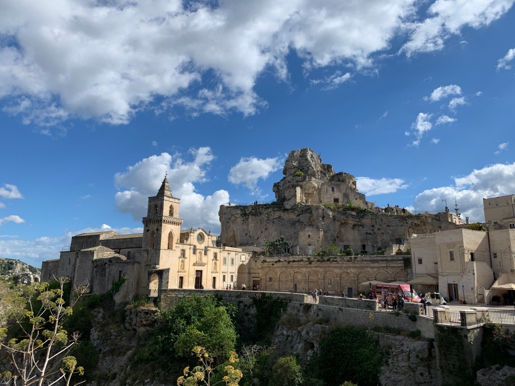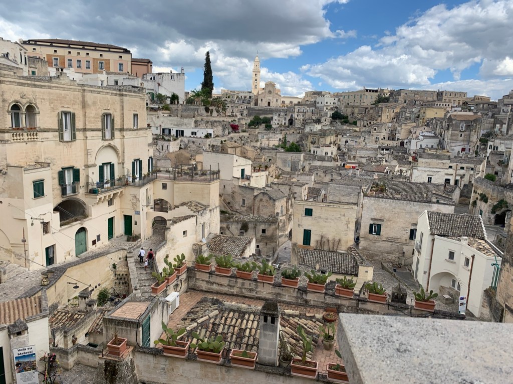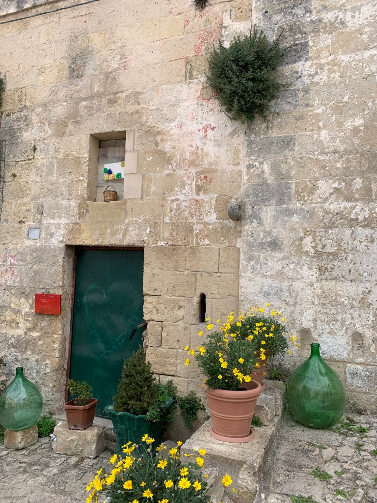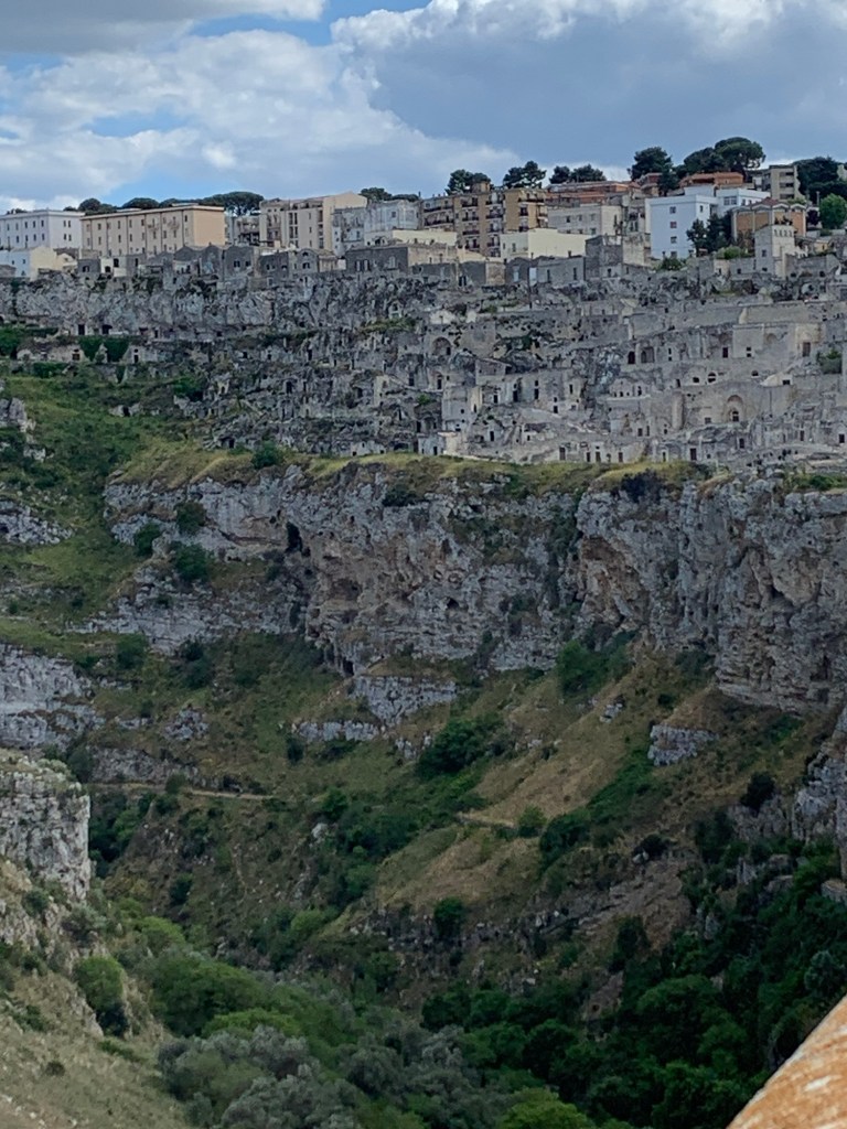 On to Matera – which was fascinating. The caves of this city have been inhabited for 9,000 years and the setting (no longer residences) is a UNESCO site. Sited on a ravine, cave dwellings were built one upon another to house large families and their livestock. They farmed nearby. There are rock churches, remarkable water catchment systems that created small neighborhoods that were mutually supportive groups. In the mid-20th century conditions were impoverished and unhygienic enough to prompt the government to evacuate the inhabitants to nearby homes. If I remember right, child mortality was roughly 30%. UNESCO recognition was eventually gained. It was a fascinating lesson.