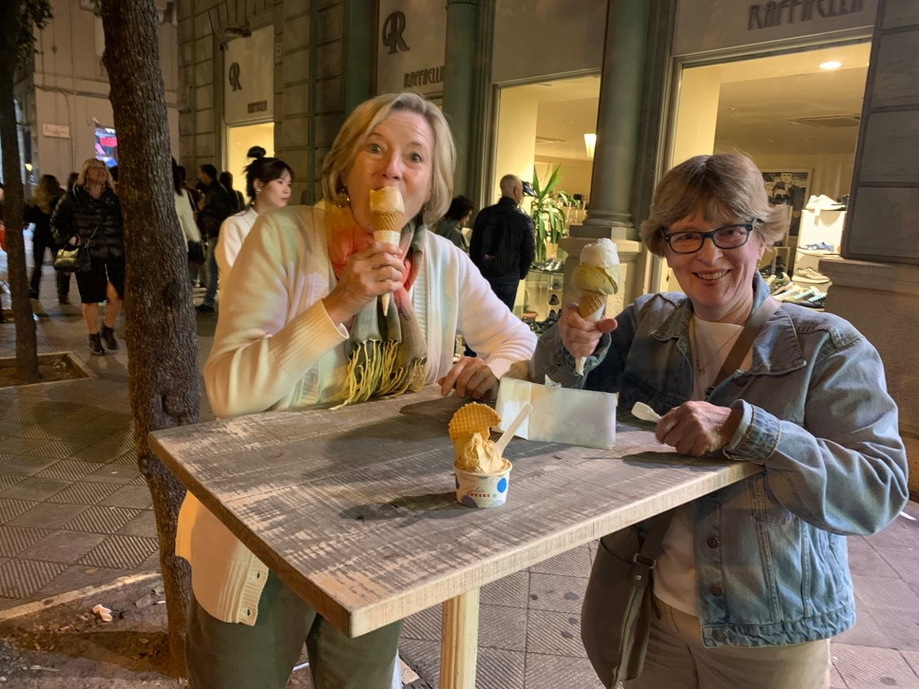 In the last two days we’ve explored and strolled through the streets of this historic center with Fillipo’s encouragement to “get lost a little”. Not at all difficult to do! But somehow a wonderful way to wile away the days. We’ve found the Duomo, the Anditeatro Roman (for blood sports), the Teatro Greco Roman (tragedies and comedies for the rich), the Castello, Villa Communale (park), eight or more of the 29 chiesa’s (churches) inside the walls and Baldo’s! The latter required a return visit – if you guessed gelateria, you’d have nailed it!