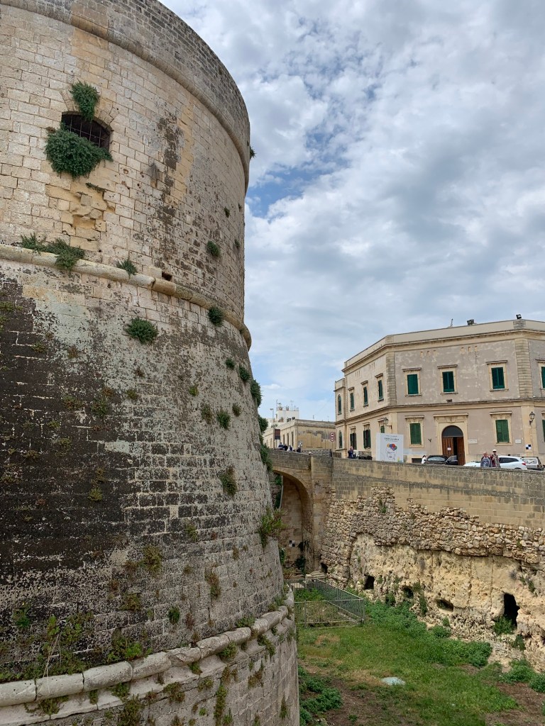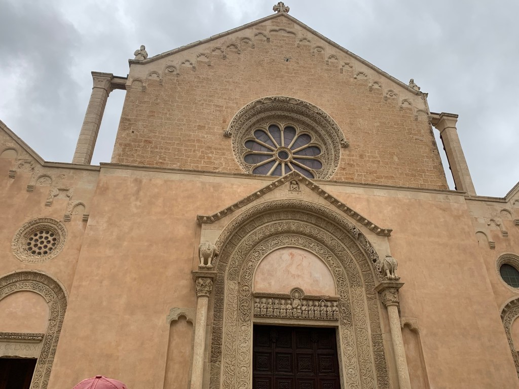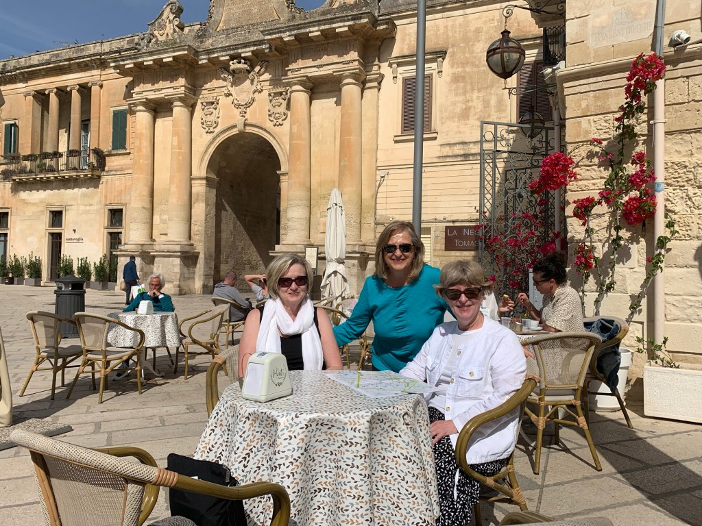 We’ve been to the tip of the heel today and enjoyed views of the blue Adriatic Sea from our tour van. Vinyards, olive trees and cacti in abundance in the rocky hillsides. We started the day in rain – but with Leccese caffe (Beth) and local pastries to start, we’re happy.