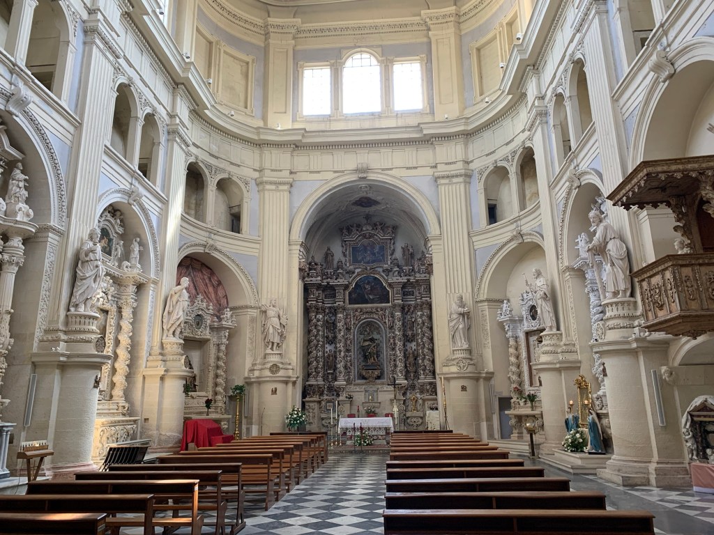 We found the cathedral in Galatina to soar in its magnificent interior. A Franciscan chiesa, it distinguishes itself from many Catholic cathedrals with the intensity of color on the inside. We were impressed. And now understand the difference between Baroque and Romanesque church architectural styles.