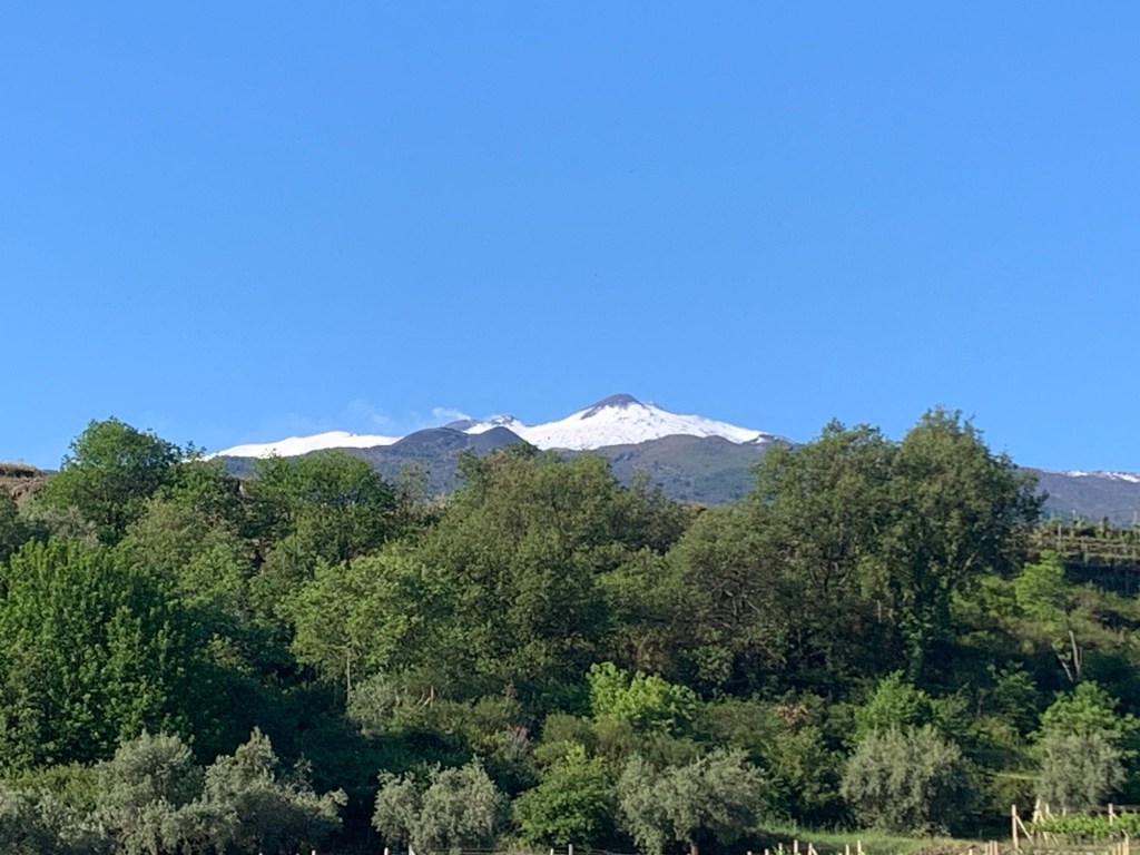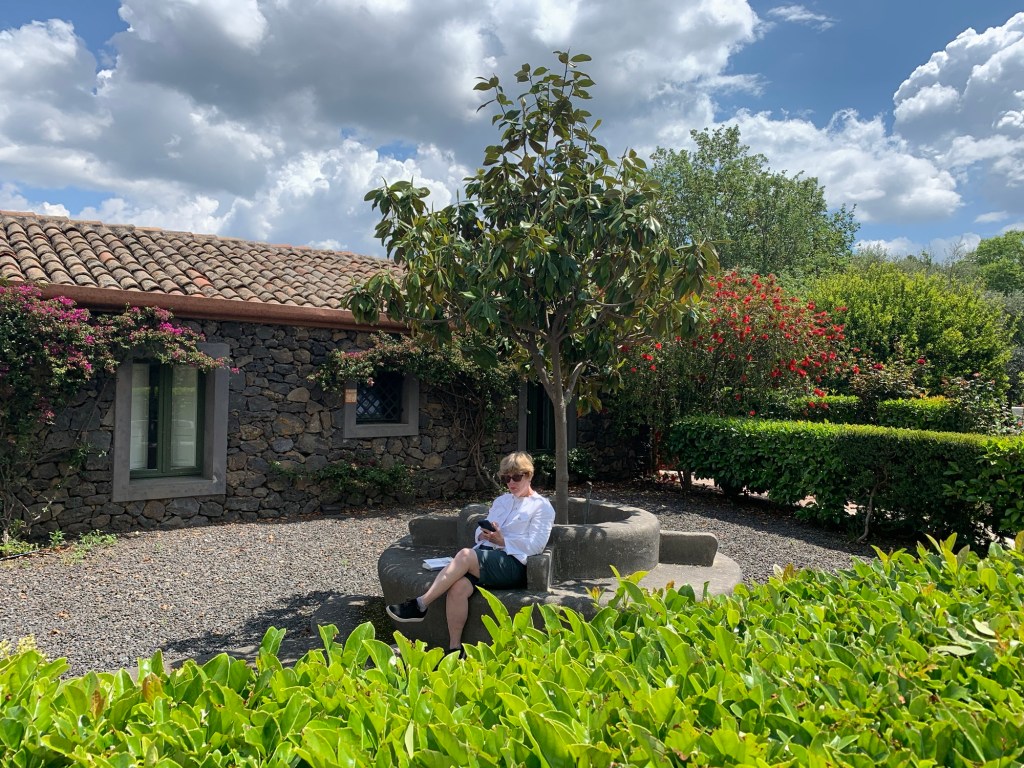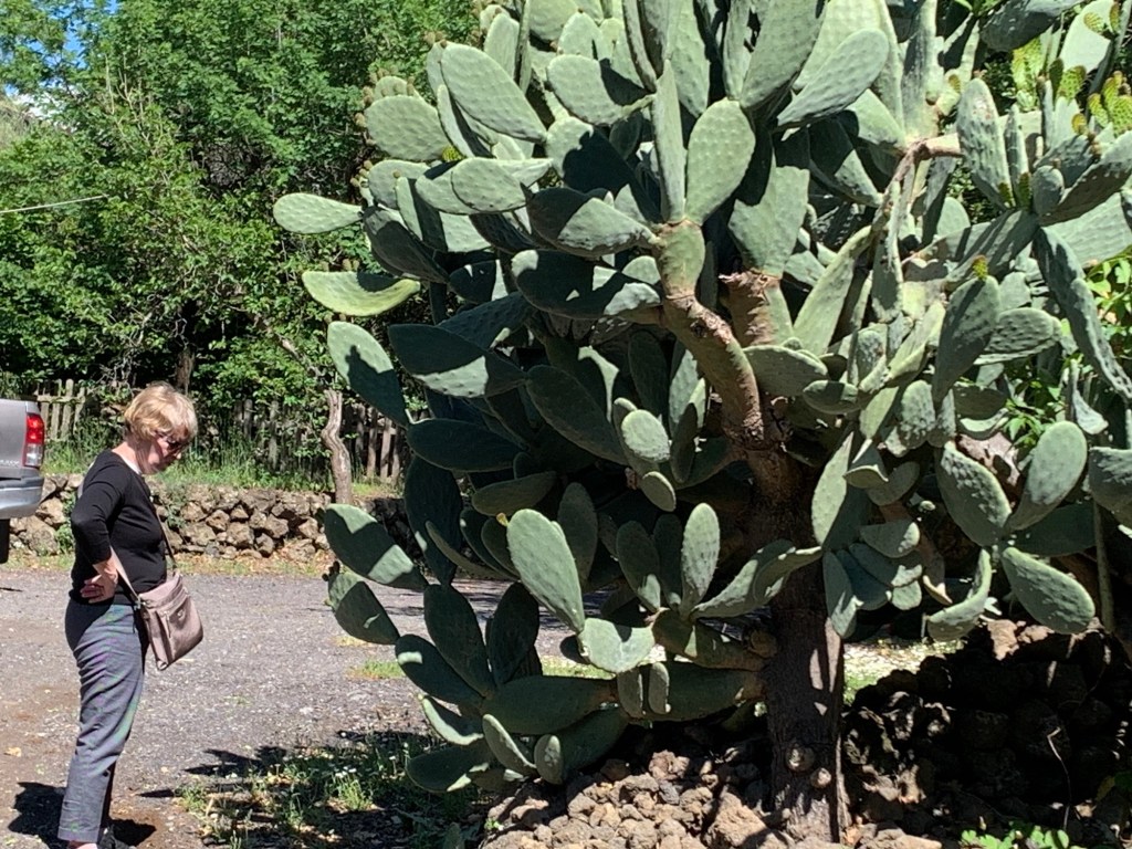 But now we are on to Sicily! And a couple days at Caverna Etnea on the north slope of Mt. Etna – the one you hear about on the news now and again. Domenico brought us from Catania to Etnea with little highlights, pointing out Taormina (Beth was there with a cruise some years ago) and the orange and lemon trees full of fruit. We’ve been pretty city bound, so we’ll relax a little here.