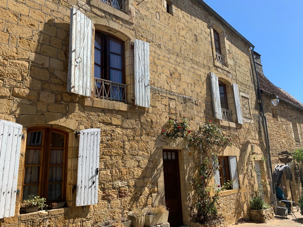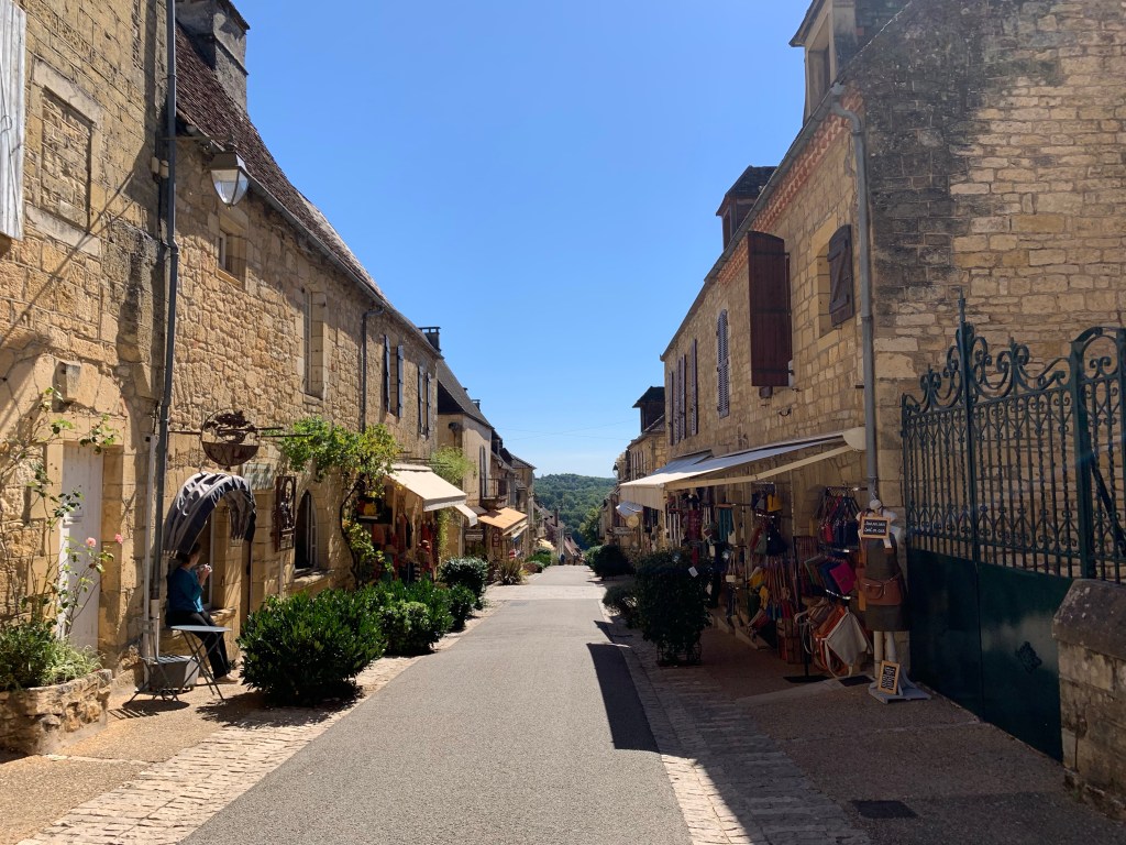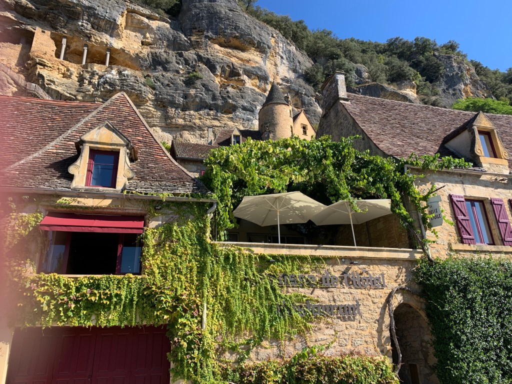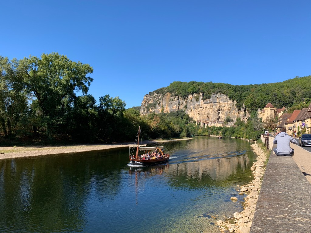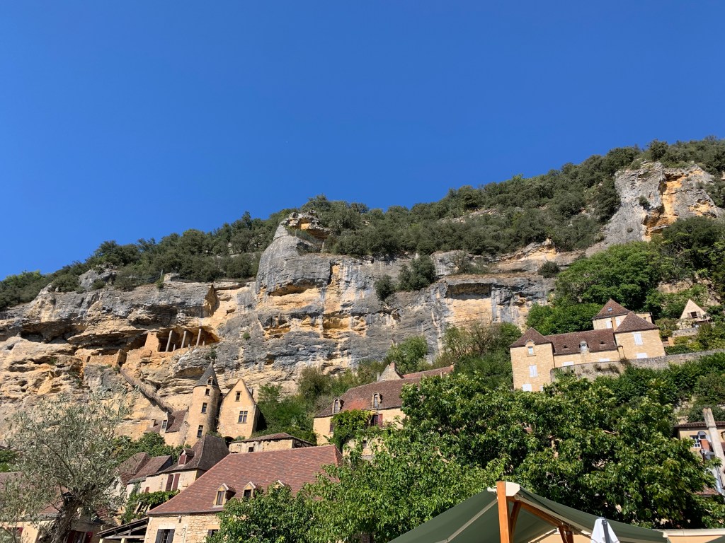 It sits along the Dordogne River. The bateau ride allows you the perspective of history, seeing the homes (now largely business enterprises) and the medieval Moyen Age caves used as homes. Even troglodytes lived here and nearby Cro-Magnon cave art exists. The last family to live in a cave did so until the early 1900’s (if I got that right) with their farm animals.
