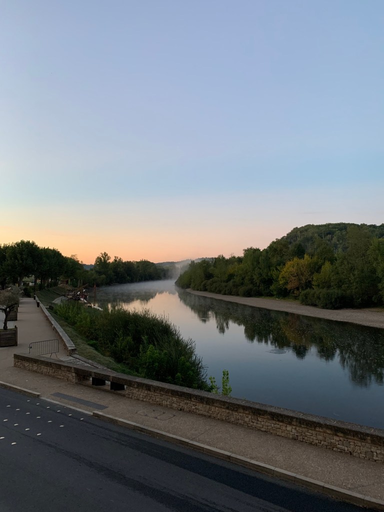 Dordogne Rive just after sunrise. Perhaps you can see the early “tell”’of fall in the mist hanging over the river to the left.