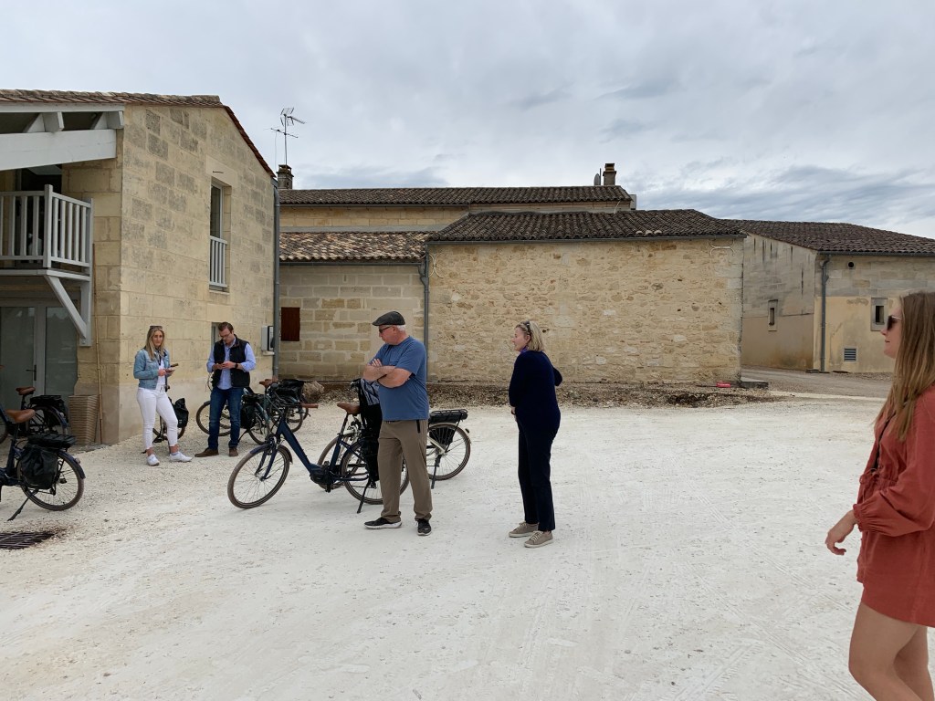 We were a small, age diverse group of eight cycling oenophiles. A couple of New Zealanders who currently live in London (young man works at BBC), an “engaged on this trip” couple from Oklahoma, a well traveled Canadian retired tech businessman and academic and the three of us! Led by Tim, who lives in St Emilion with his wife and three sons where our cycling begins. He has two business partners we encountered and an office in Bordeaux as well.