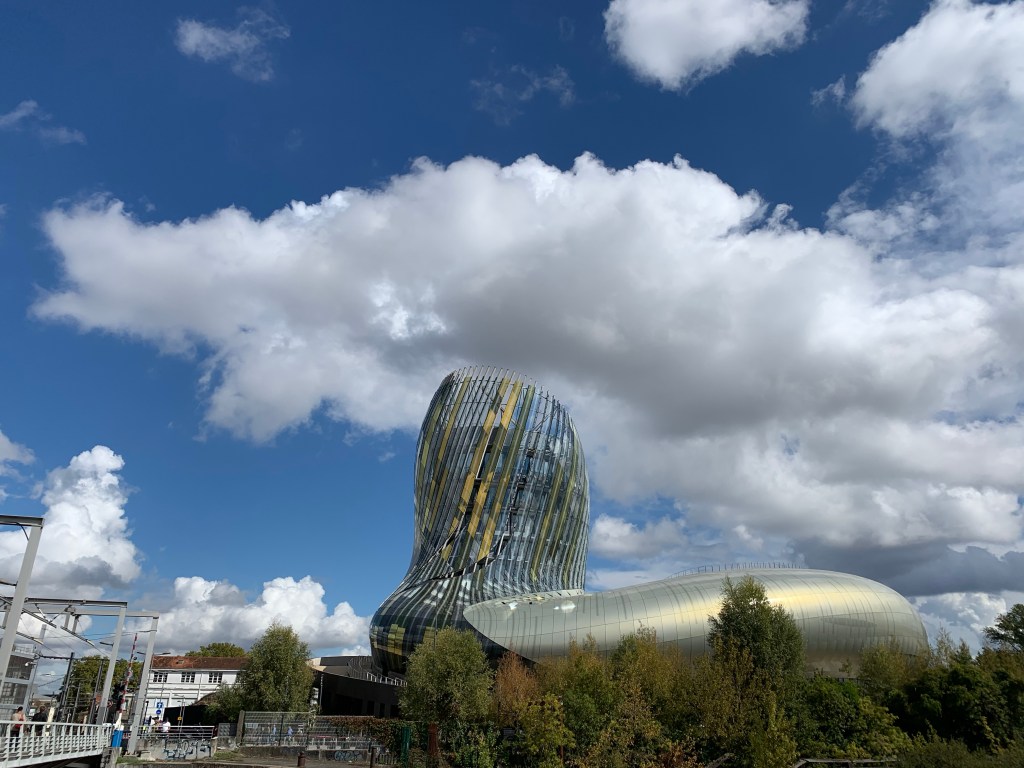 Mary and I snuck a tasting in at the Cite du Vin ( one up on Gene?). After lunch we headed by tram to the Cite du Vin. We’re on the eighth floor exterior tasting balcony