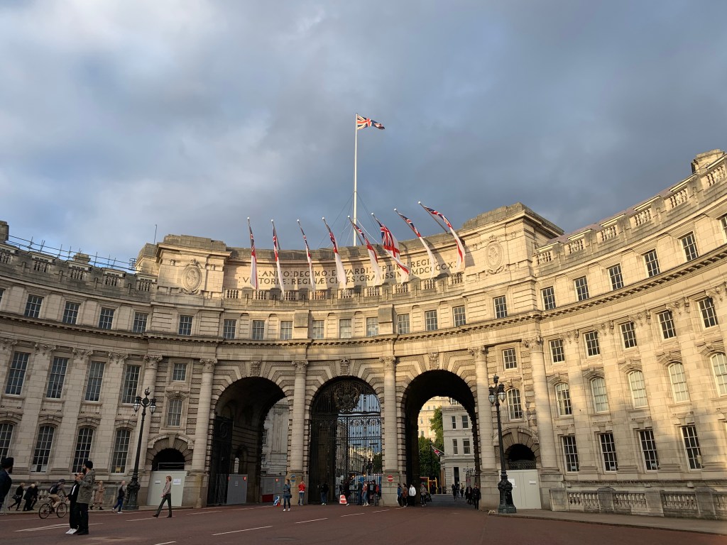 Admiralty Arch. And the first glimpse of Britons in mourning as we walked through and a little way along a flag draped Mall to Buckingham Palace.