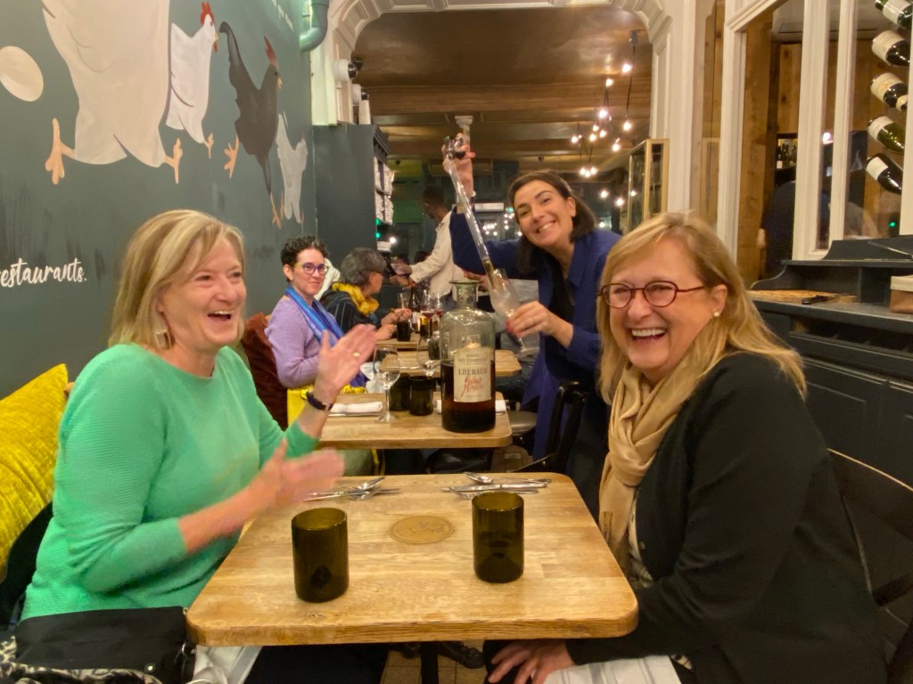 To that we added a play we picked up at TKTS called Eureka Day at the Old Vic, a work that used a mumps outbreak in a private school as a proxy for the current Covid vaccine cultural wars. Helen Hunt was the lead. The production used display of texting conversations on the background set during a Zoom meeting to great effect ala Dear Evan Hansen style (hilarious, but conveyed opinions, misinformation and science bias very deftly). The Old Vic, a traditional cultural icon, is near The Vaults I’d visited with Brian and Scott last time around – an alternative artistic space (think Banksy style graffiti artists with social justice and charitable endeavor overtones, a creative space, bars etc under Waterloo Station). We had a nice small plates tapa and wine experience in the neighborhood at a spot called Unwind.