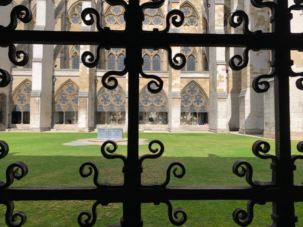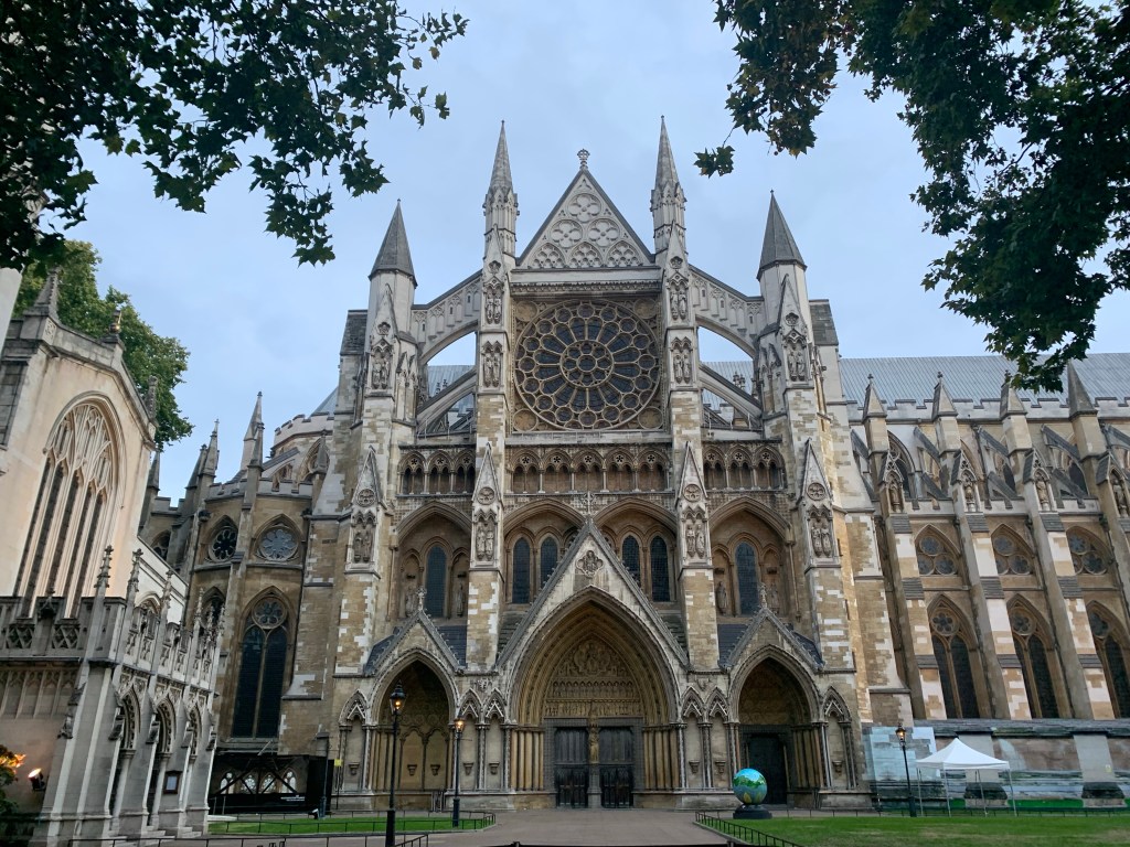 We appreciated the National Gallery – despite the fact that we initially chose it just to get out of the rain one day. And Westminster Abbey always fascinates me. It’s the biggest cathedral we’ll see this trip as Notre Dame is still deep into restoration because of the fire some years ago. This church mingles the spiritual heart of a faith with secular heroes and martyrs. And is full of history! I appreciate the Poets Corner greatly in that vein. Because the Abbey is the setting for Royal weddings, coronations and burials it felt particularly relevant since Queen Elizabeth’s death just weeks ago. Even so, the concept of monarchy is a bit difficult for me. We enjoyed the Queens Diamond Jubilee Gallery, especially the overhead view of the Nave, despite the circular stairway climb (we took the elevator back down – ha!). It was a worthwhile extra there.