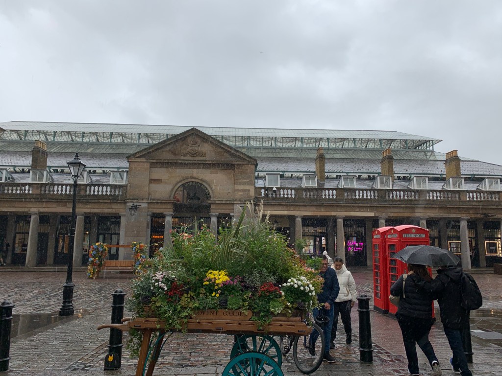 Our first exploration was to the West End beginning with Covent Garden. But we got off the Tube to quite a bit of rain! Had to wait it out with lunch, which wasn’t too bad.