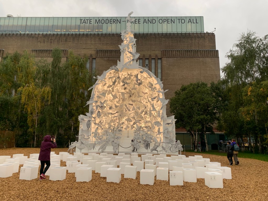 Though the walk from St Paul’s to the Tate Modern over the Millennial Bridge is great with views to Tower Bridge and into the Southwark area, the Tate I’ve been so enamored of escaped us this trip. With rain, renovations that currently close the 10th floor cafe view and one thwarted attempt to gain an evening entry – it was discouraging. And when finally there, the current exhibitions were dark and very challenging in tone. The artist exhibitions were deep into social justice commentary. Cezanne opened after our departure.