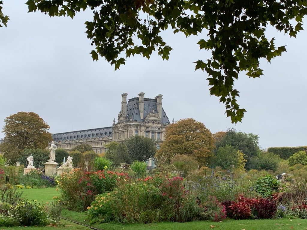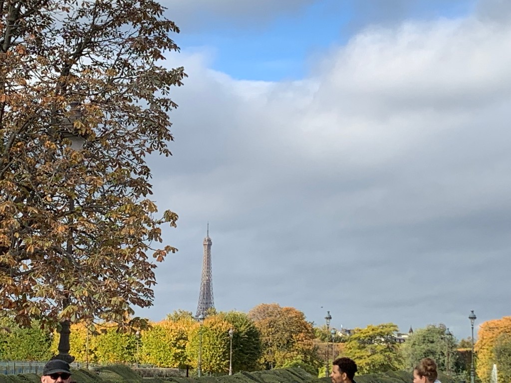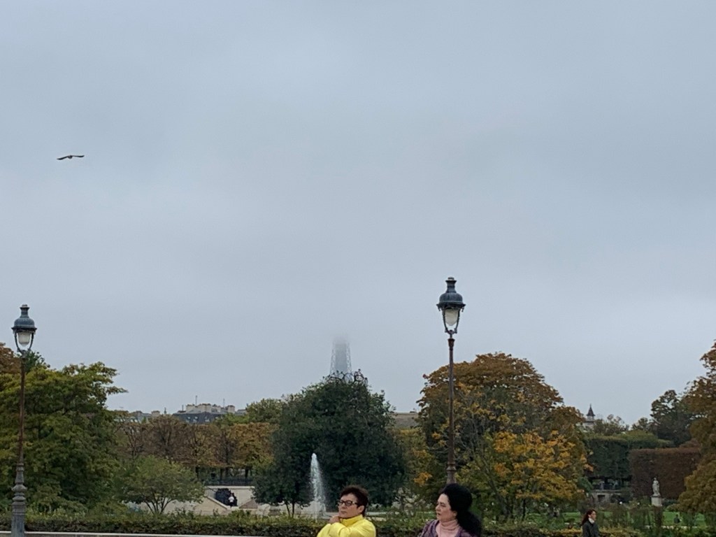 Really does feel and look like fall our first day here. Got ourselves to the Louvre and gave up, but persevered in our museum quest with the jewel that is L’Orangerie. We weren’t exactly early arrivals to the Tuileries or the Musee du Louvre grounds and palais, but there was still a fog that hid the Eiffel Tower from us until well after noon.