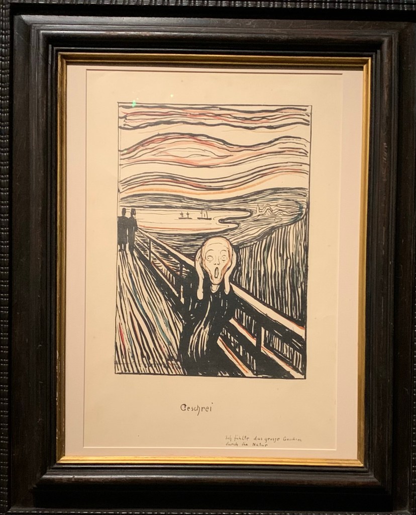 Munch is most famous for The Scream (more evocative in Norwegian “Geschrei”) in lithograph.