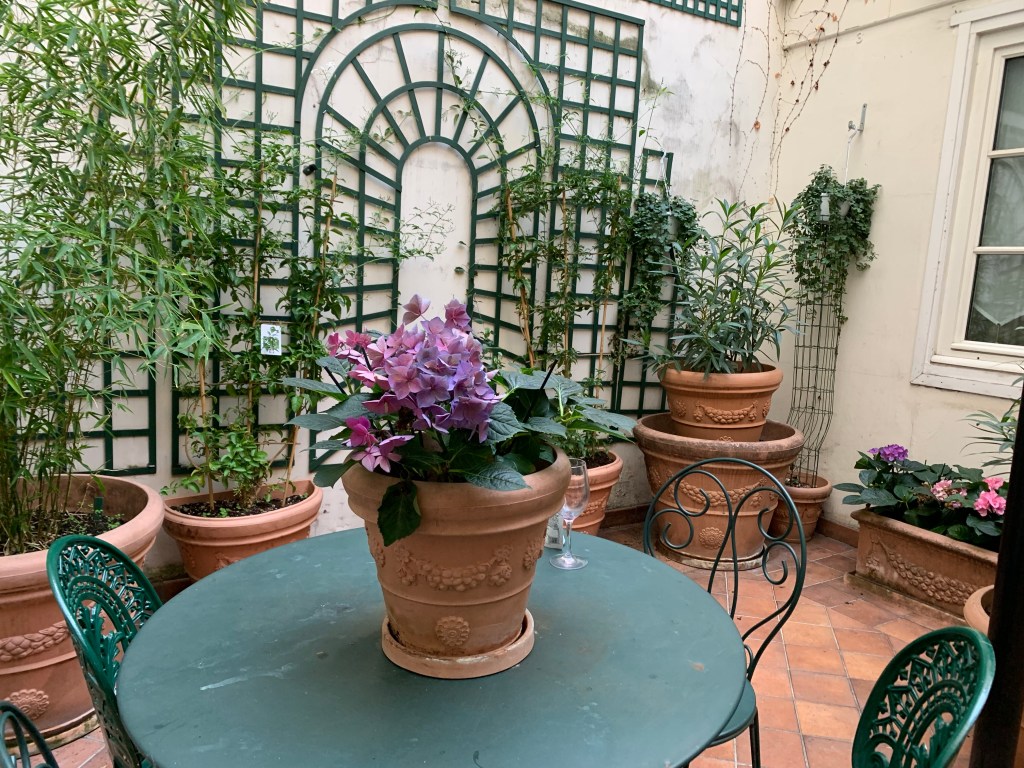 Voila! The courtyard prominently displayed on the website and brochure was undiscovered until Day 3. Mary brought down our complimentary wine and some nuts to enjoy the space. (Didn’t quite meet expectation, but enjoyable and quiet all the same.)