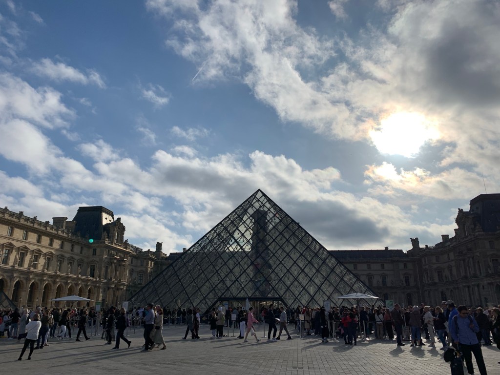 The weather gods took pity on us and the overcast sky turned to a gorgeous blue while we were in the Louvre. From dark to sunny we could see the Eiffel Tower today.