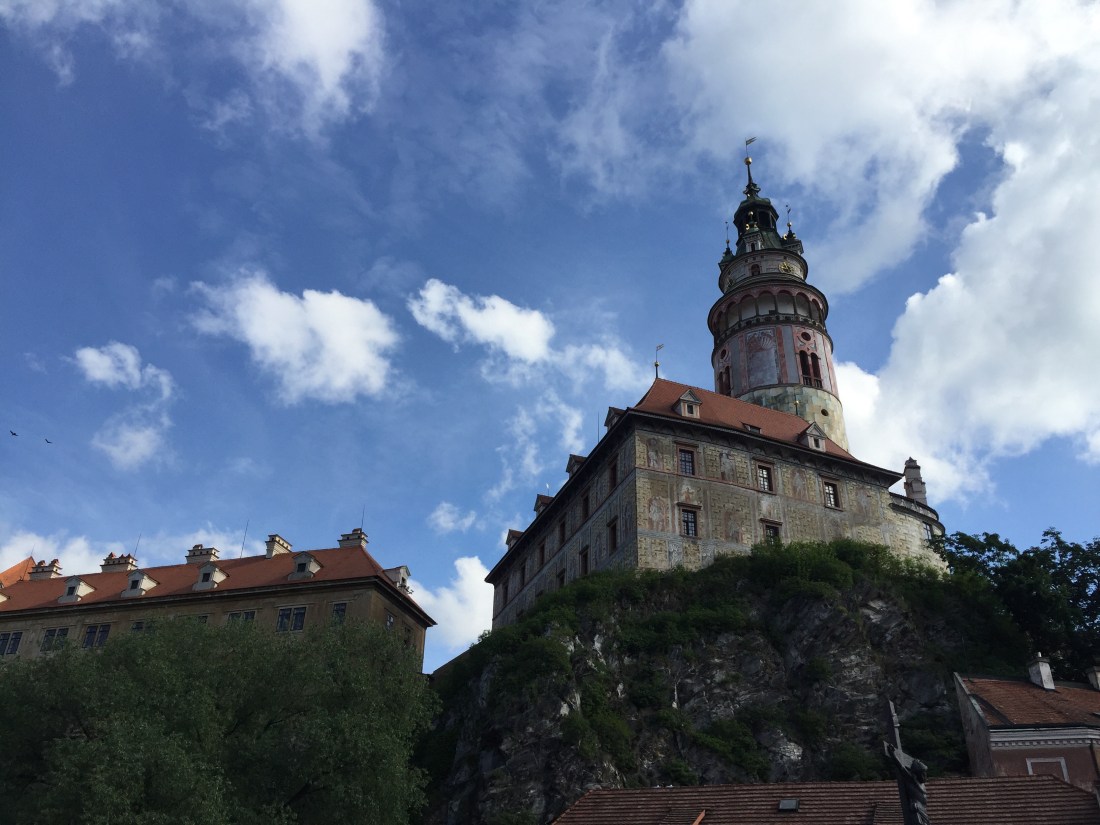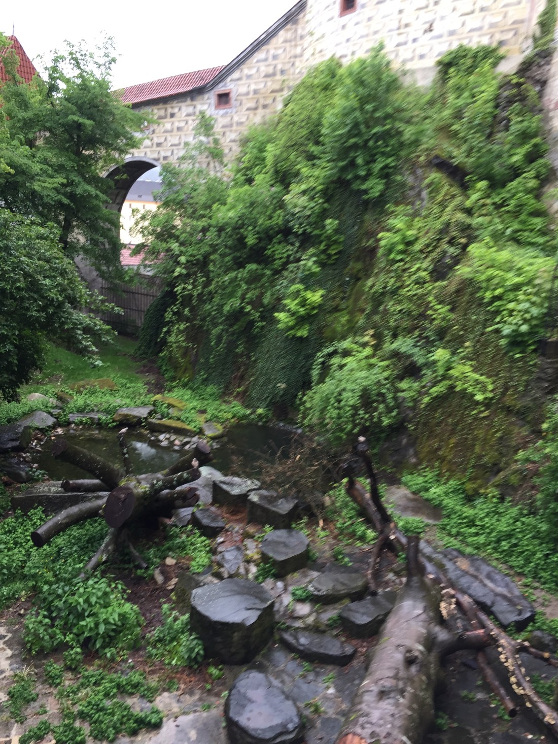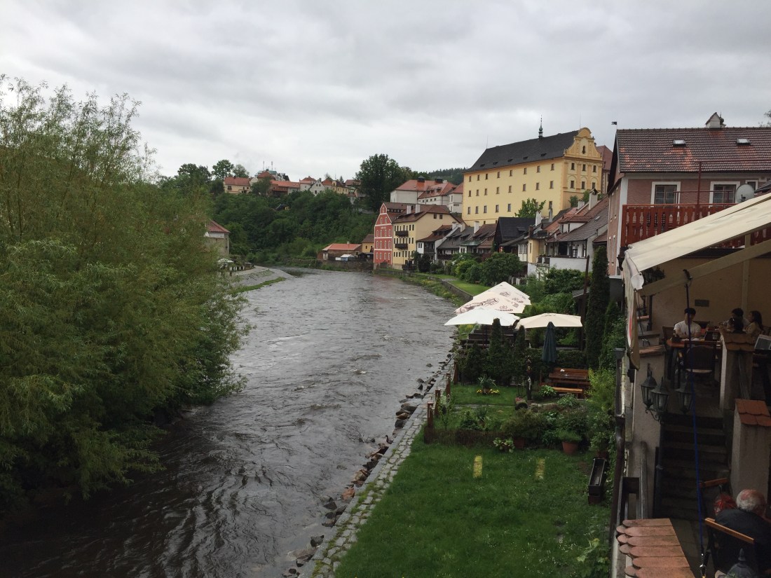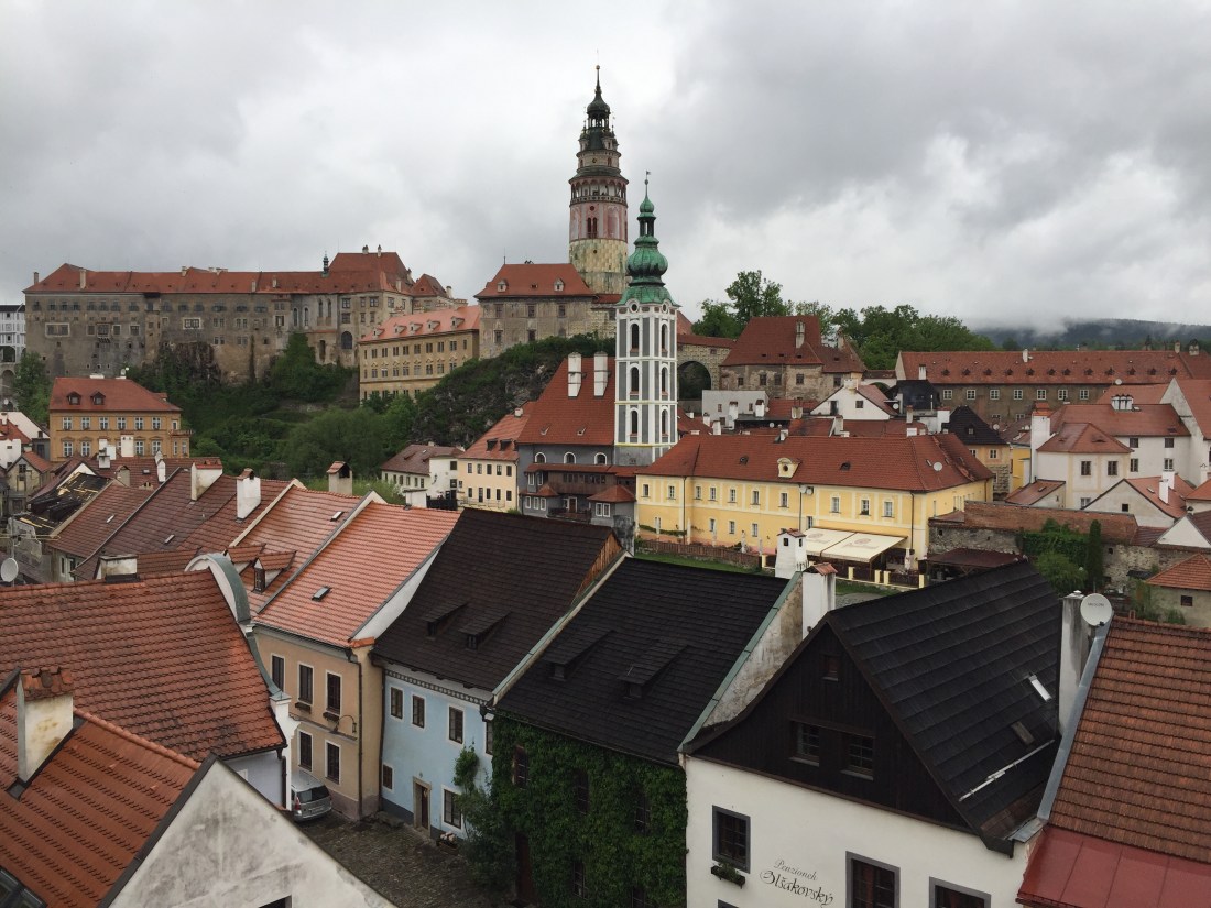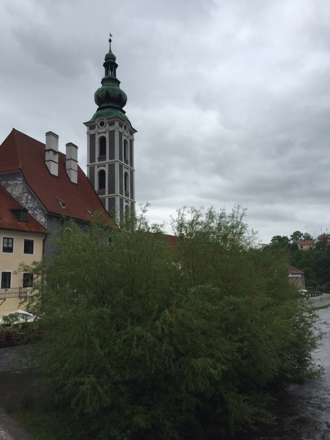 About a three hour shuttle to C. Krumlov with a group of sleeping Asian women. The terrain and foliage are very Pacific Northwest, down to the rain clouds! But we can recognize beautiful countryside through the raindrops. Sadly our bathroom stop was a McDonald’s (they’re everywhere, along with KFC and Starbucks) but unlike those at home the bathrooms were not at all dependably clean. At trips end we have NO time to chat up our driver, Petr, as our arrival to the square from which we needed to walk coincides with a heavy downpour. But the hotel is just round the corner.