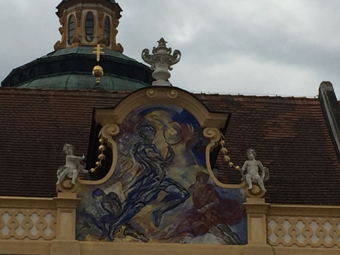Melk’s attraction was it’s abbey and hillside town. We hiked up to the abbey grounds and chose not to pay for a peek at yet another golden frosted church interior. But this one seems to be striking some modern notes in its grounds.