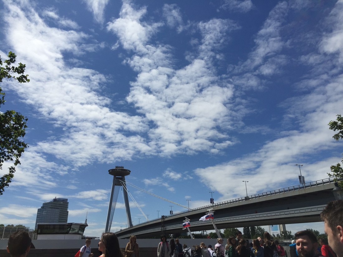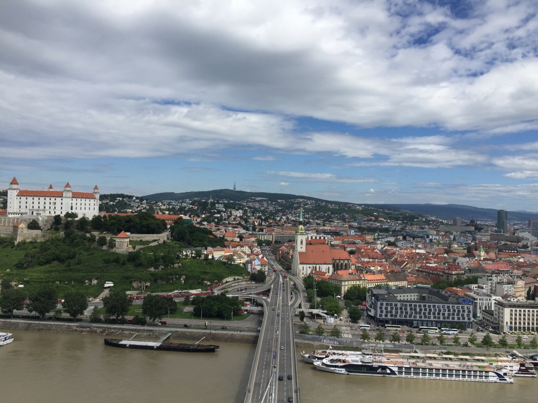 Began our day by securing our train travel out of Bratislava. Used the bus to get to the station with instructions from our kind reception guy, Dusan. Took us some 10 mins to sort out the right bus line and make a ticket purchase, bought our train ticket, then helped someone else get to the zentrum via bus. We then felt so emboldened we thought we might be able to get to the castle and walk down rather than hike up without really seeing a metro map. Well, only one stop beyond zentrum we found we were in Aupark and the no mans land near the UFO. Somehow seemed destined to be, so up we went.